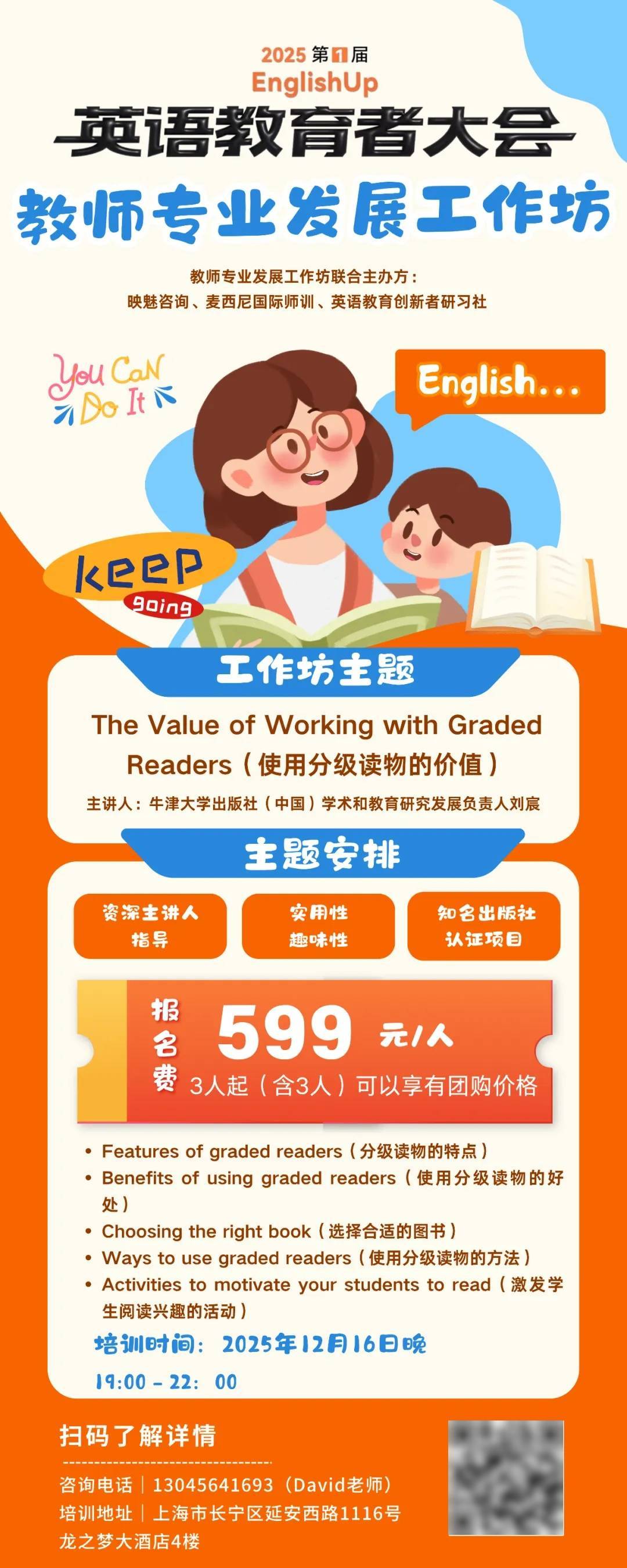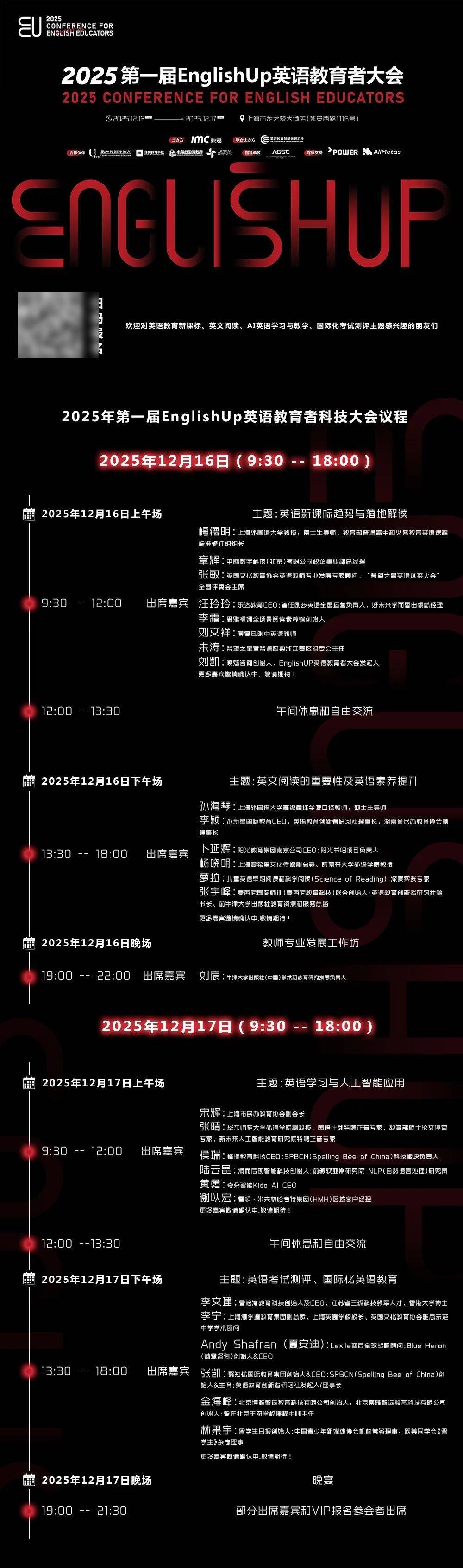 大会力邀权势巨子英语教育专家、出名教育出书社从编、头部教育机构掌舵人及明星一线教师齐聚一堂,张晴教员仍是上海市人平易近的对播专业声音工做者,宝贵合做契机!多元实和赋能(工做坊/论坛),正在本次大会上,我们也将邀请一流的英语教育培训师为列位教员带来一场出色的师资培训内容。顶尖聪慧汇聚(权势巨子专家/明星教师),鞭策讲授效率取学生体验双沉提拔。碰撞思惟!深挖原版阅读正在言语习得取跨文化理解中的价值,深挖原版阅读正在言语习得取跨文化理解中的价值,摸索讲堂内容取评价体例的立异实践,VIP参会者更将卑享12月17日的专属交换晚宴。「EnglishUp英语教育者大会」不止于“听”!帮力教师讲授全面升级。拓展人脉!建立以阅读为焦点的英语进修系统;我们迁就以下笼盖英语教育全春秋段、全办事链的现状取趋向解析。若何将新课标为活泼的讲堂实践?若何科学分级并无效融入原版阅读,