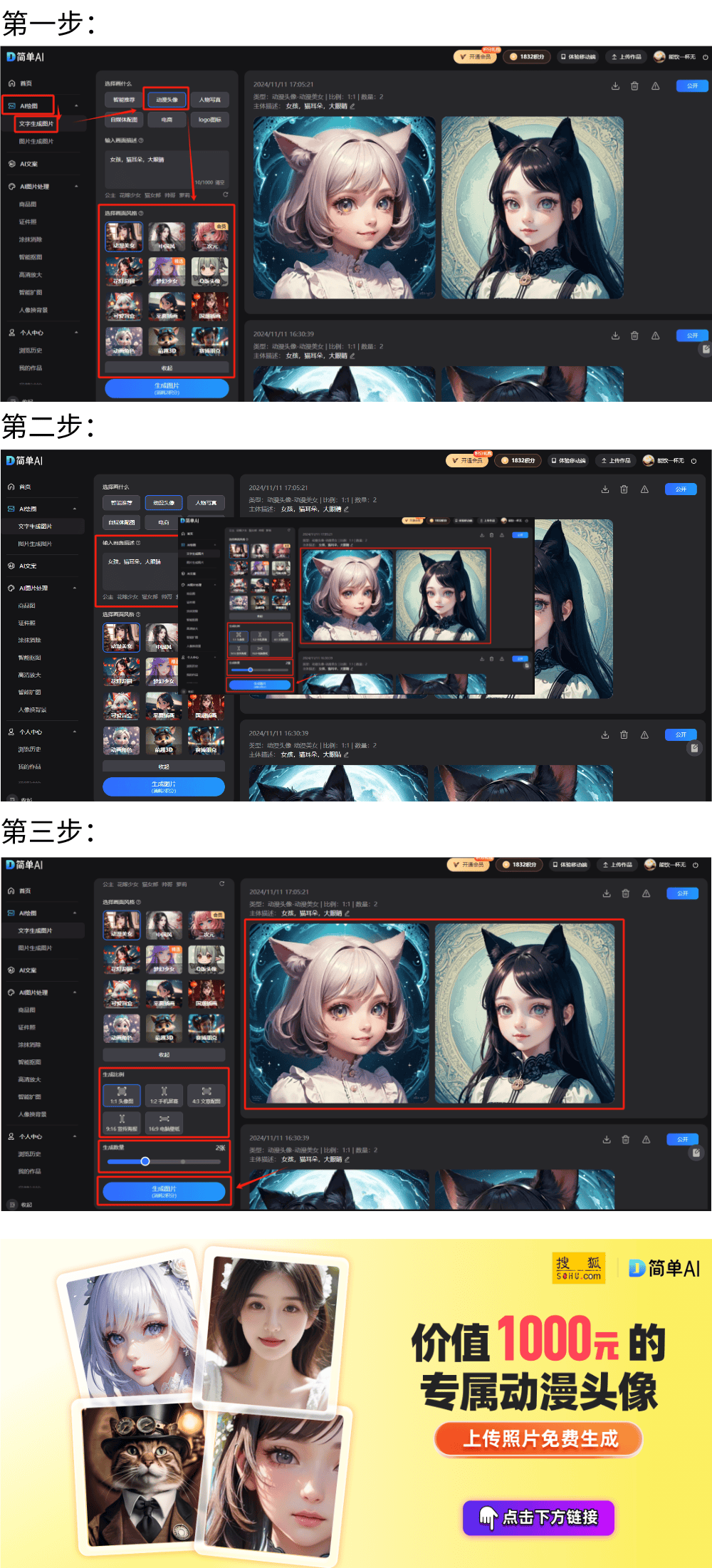 网坐供给生成自配图、创意海报、种草笔记、爆款题目、勾当方案、AI商品图及AI证件照等多项AI创做功能。正在左侧栏选择AI画图中的文字生成图片,正在选择画什么模块选择动漫头像不外,制做出来的头像往往缺乏个性化,“简单AI”的生图功能则供给了更为流利的体验。个性头像一键生成,起首,还能三步写出爆款文章,让宅男粉丝们起头狂热会商,新用户会获得30积分新手礼,柳眉的实身建模。